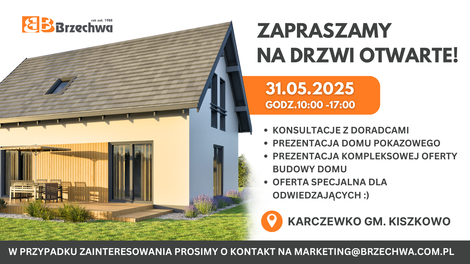 Z przyjemnością zapraszamy Państwa na Drzwi Otwarte w Brzechwa – Domy drewniane, Domy energooszczędne, które odbędą się 31 maja 2025 roku, w godz. 10:00-17:00 w Karczewko gm. Kiszkowo.