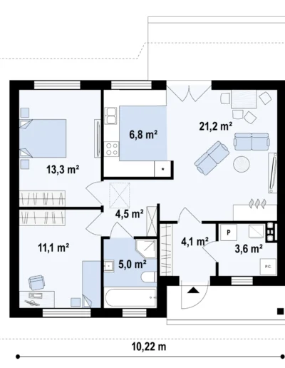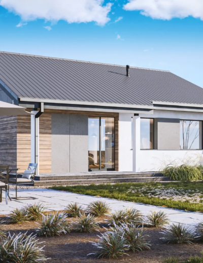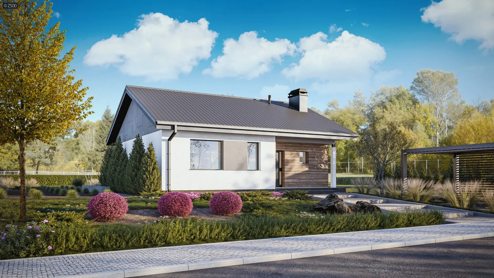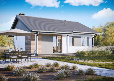 Projekt Z78 to niewielki, parterowy dom o prostej bryle z dachem dwuspadowym, który wyróżnia się nowoczesnymi akcentami i funkcjonalnym układem wnętrz. Podzielony na strefy, oferuje dwa pokoje, salon z otwartą kuchnią, praktyczne pomieszczenie gospodarcze i liczne miejsca do przechowywania, co czyni go idealnym dla małych rodzin.